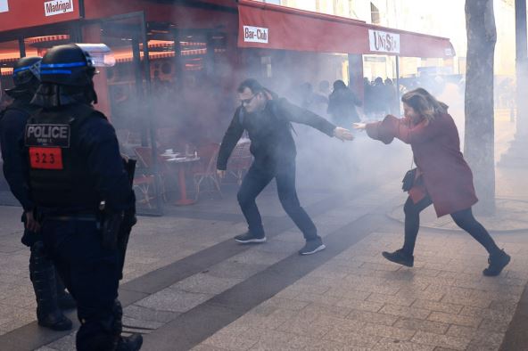 Na Jelisejskim poljima, prema snimcima sa mreža, vidi se i dim od suzavca koji je policija ispalila kako bi rasterala okupljene. Na snimku se vide građani koji su preko lica stavili delove garderobe kako bi izbegli udisanje suzavca, a neki su potražili spas u obližnjim buticima.