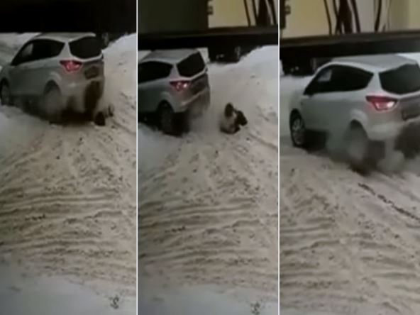 Vozač, misleći da je zapeo u sneg, prvo daje gas, pa se zatim kreće unapred kako bi ponovo pokušao da pređe “prepreku”. Kada je žena pokušala da ustane, ponovo auto prelazi preko nje, gurajući je nazad u sneg.