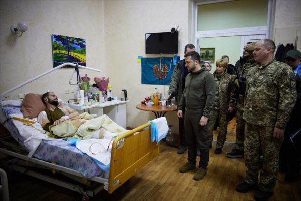 Na snimku, koji je dostavljen medijima iz kabineta Zelenskog, vidi se kako je Zelenski razgovarao sa vojnicima i lekarima.