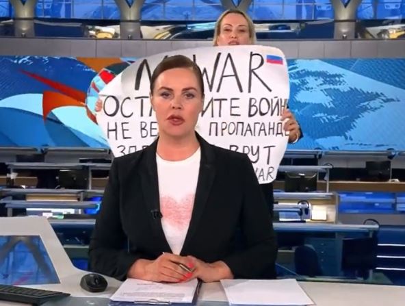 Marina Ovsjanikova je optužena za "organizovanje nedozvoljenog javnog događaja" i može biti kažnjena novčanom kaznom od 30.000 rubalja (oko 200 funti), radom u zajednici ili 10 dana zatvora ako bude proglašena krivom. To znači da se ruski novinar ne tereti po novom ruskom zakonu o "širenju lažnih informacija o ruskim oružanim snagama", piše Bi-Bi-Si.