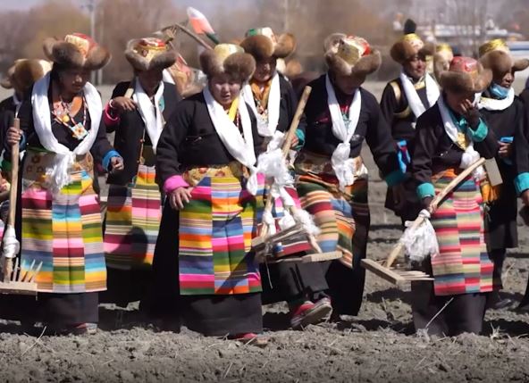 Stotine tibetanskih seljaka u svečanoj nošnji rade u polju, pevaju i plešu, prizivajući dobru žetvu ove godine.