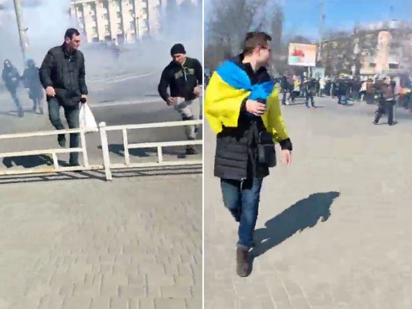 Ukrajinski centar za strateške komunikacije saopštio je da su ruske snage bacile šok bombe na ljude koji su prisustvovali proukrajinskom skupu. Neke granate su eksplodirale pod nogama demonstranata, tvrdi se. To je najveći od samo nekoliko gradova koje su zauzele ruske snage od invazije prošlog meseca.