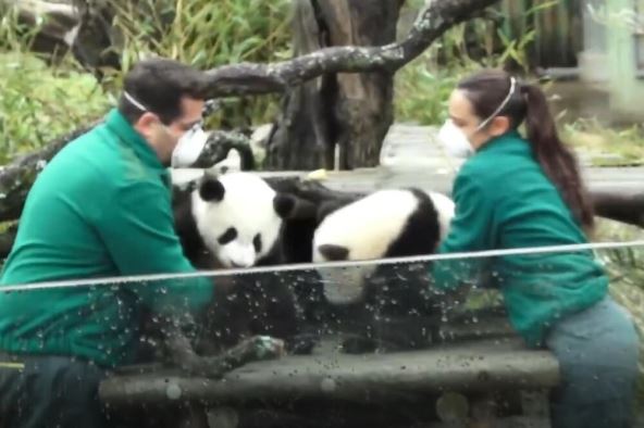 Šestomesečni blizanci džinovske pande, Joujou i Đijuđiju prvi put su se u ponedeljak pojavili u javnosti na proslavi 50. godišnjice Madridskog zoološkog vrta u Španiji.
