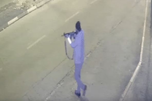 Na snimku se vide dvojice muškaraca koja idu ulicom i pucaju iz automatskog oružja.