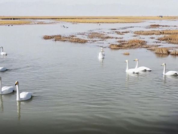 U močvarnom području jezera Sugan u okrugu Aksaj, provincija Gansu, porasla je temperatura i led i sneg su se otopili. Ptice kao što su čaplje, divlje guske i divlje patke su migrirale ovde, dodajući vitalnosti tihom visoravnom jezeru.