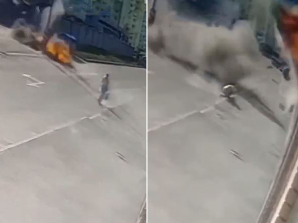 Na snimku nadzorne kamere vidi se raskrsnica u Harkovu koju žena prelazi dok nosi kese u rukama. Ubrzo dva projektila eksplodiraju nedaleko od nje i od siline udarca ona pada na zemlju.