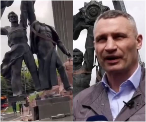 "Rušenje spomenika je odgovor na napad Rusije na Ukrajinu! Prvo je glava ruskog radnika izgubila glavu kada su pokušali da podignu skulpturu. Zatim su pokušali da poseku postolje na koje su bile postavljene figure. Ispostavilo se i da je teško. Ali stručnjaci su pronašli izlaz - presekli temelj spomenika. Bukvalno, iskorenjena i uklonjena skulptura!", napisao je gradonačelnik Kijeva Vitalij Kličko na Telegramu.
