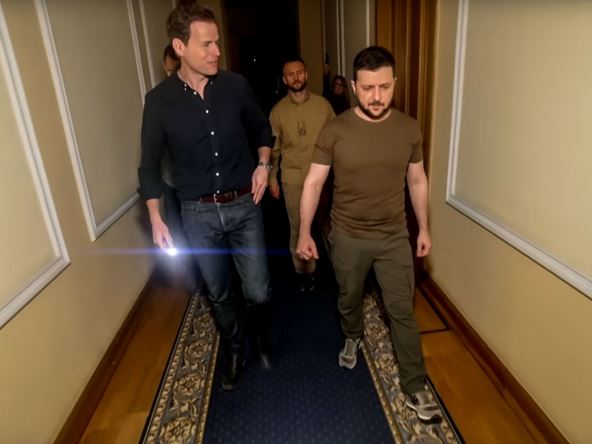 "Odvedeni smo u prostoriju u kojoj se samo nekoliko dana ranije, američki državni sekretar Entoni Blinken sastao sa ukrajinskim liderom radi istorijskih razgovora. Ima devet lustera, četiri džinovske ukrajinske zastave, a na glavnom zidu je ogromno umetničko delo žene sa podignutim rukama iznad glave – rečeno nam je da se zove Oranta, ikona koja brani Kijev. Legenda kaže da sve dok Oranta nastavlja da pruža svoje ruke iznad Kijeva, grad će ostati neuništiv. Dok naš snimatelj postavlja kameru, mogu da osetim da predsednikov sekretar za štampu nije zadovoljan kadrom.