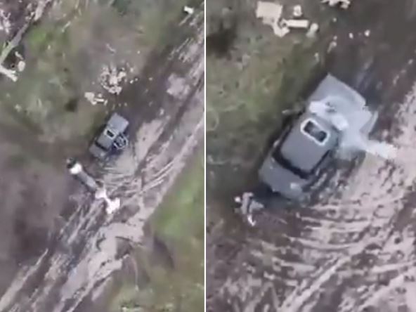 Na snimku se vidi kako kamera na dronu zumira vozilo u pokretu, a onda se vidi i trenutak kada dron ispušta bombu (0:11 na snimku). Samo par sekundi kasnije, gust oblak dima pojavljuje se iznad i oko automobila. Bomba je prošla kroz šiber i onesposobila vozilo. Jedan ruski vojnik uspeo je odmah da izleti iz vozila dok se na snimku vidi da su dvojica ostala unutra zarobljena dok je vozilo nastavilo da se kreće još nekoliko metara pre nego što je eksplodiralo.