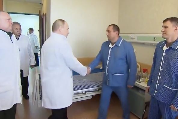 Obojica su nosili bele mantile i porazgovarali su sa nekoliko ranjenih ruskih vojnika, a Putin je jednom od njih rekao da će sin biti ponosan na njega. Obojici je poželeo brz oporavak i rekao da su "u dobrim rukama".