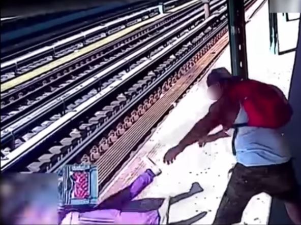 Čovek, koji nosi belu majicu bez rukava, bejzbol kapu i crveni ranac, zgrabio je žrtvu sa leđa i gurnuo je na šine u podzemnoj železnici. Žena se prvo srušila na zemlju, a onda se prevrnula preko ivice platforme pravo na šine.