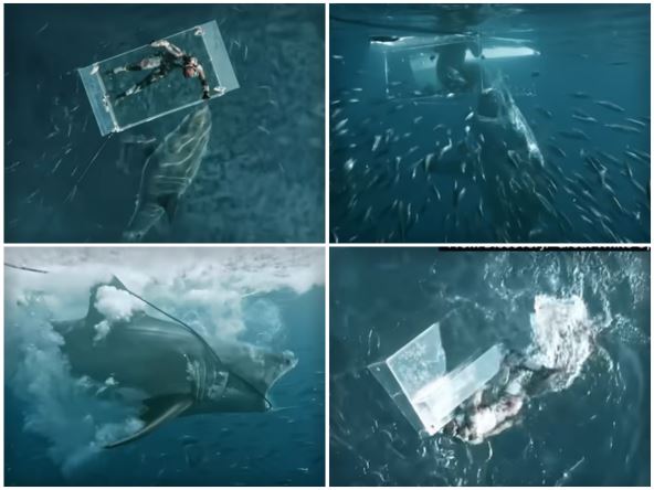 Na početku snimka, Džimi leži u prozirnoj kutiji na površini vode. On posmatra kako radoznalo morsko stvorenje klizi kroz more - ali zver počinje polako da se šunja sve bliže kavezu. Ogromna ajkula tada žestoko ubrzava kroz jato riba prema kutiji pre nego što pokuša da zagrize sa svojim moćnim čeljustima.
