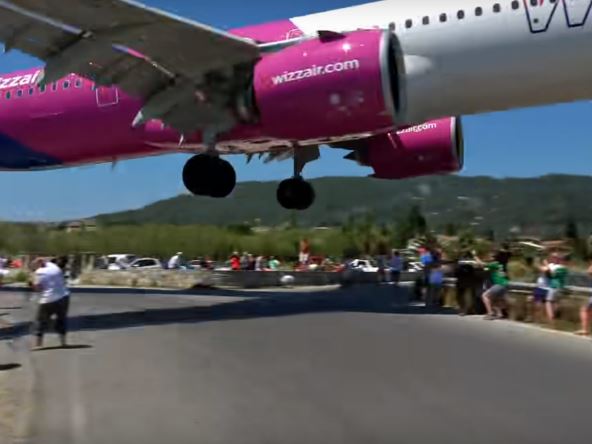 Putnički avion kompanije Viz Er proleteo je svega nekoliko metara iznad glava turista i sleteo na aerodrom na Skijatosu. Na snimku se vide ljudi kao zbunjeno gledaju avion koji se približava i sve je niže i niže. Jedan posmatrač čak počinje da se udaljava sa puta u iščekivanju niskog sletanja.