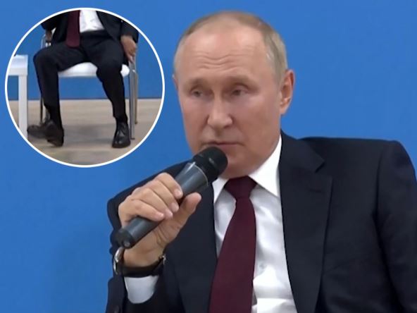 Vladimir Putin je pokazao dodatne znake svog navodnog narušenog zdravlja dok su mu se noge manično trzale dok je juče ruskoj deci objašnjavao zašto ratuje u Ukrajini.