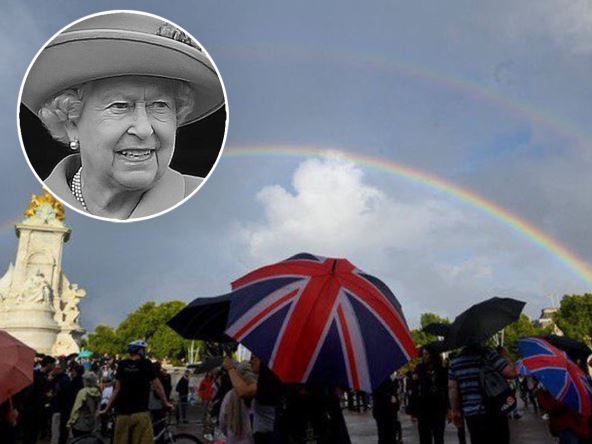 Dvostruka duga pojavila se iznad Bakingemske palate nakon objave smrti Njenog Veličanstva Kraljice. Članovi javnosti su se okupili ispred palate da odaju počast. Ljudi su ceo dan lutali oko palate od kad su se pojavile vesti o kraljičinom zdravlju.