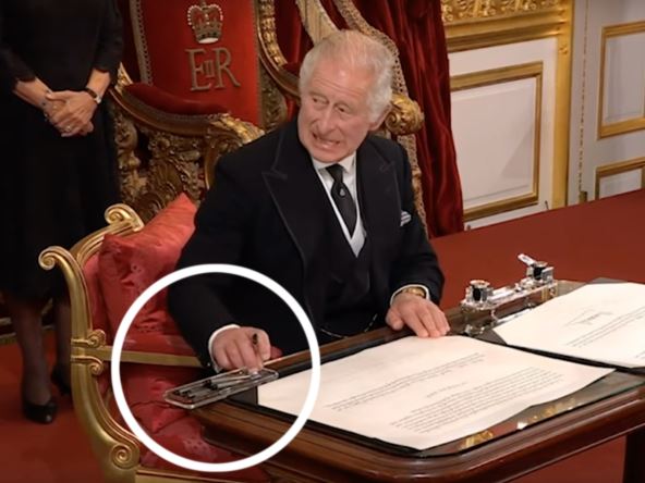 Dok je išao da potpiše istorijsku Proklamaciju, kralj je pokazao pomoćniku da pomeri kutiju sa olovkom sa njegovog stola, koji su gledaoci opisali kao "premali“ za ogroman dokument i kancelarijski materijal. Jedan od zabavnijih trenutaka bio je kada je Čarls zamolio obližnjeg pomoćnika da skine kutiju sa stola kako bi mogao da potpiše drugi deo velikog dokumenta. Set nalivpera koji je koristio da potpiše značajan dokument bio je poklon njegovih sinova prinčeva Harija i Vilijama.