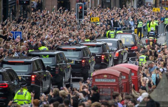 Na svom šestosatnom putovanju kroz Aberdin, Dandi i Pert, mrtvačka kola sa kovčegom je pratila kraljičina ćerka, princeza Ana. Suprug princeze Ane, Tim Lorens, takođe ih je pratio. Kraljičino telo će sada počivati u Holirudhausu tokom večeri, gde će članovi kraljevskog doma moći nasamo da odaju počast. U ponedeljak će biti prebačeno u katedralu Svetog Džajlsa, gde će škotska javnost moći da oda počast, prenosi "Gardijan".