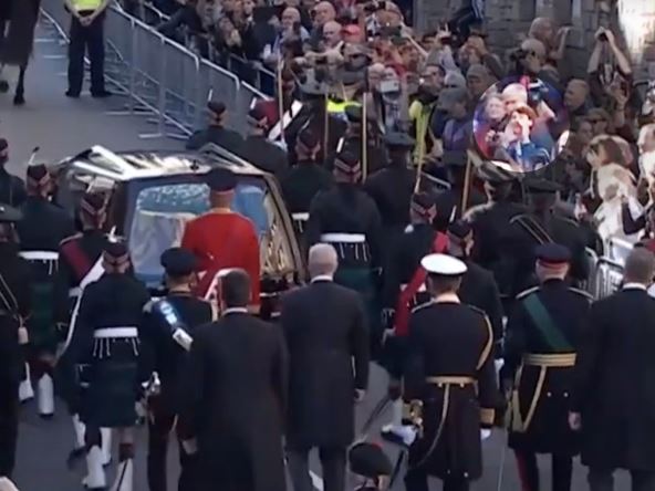 Policija na konjima u svečanoj odeći jahala je ispred parade. Kralj Čarls je išao svečano u korak sa svojom braćom i sestrom iza kovčega svoje majke. Okupljeni ljudi su ućutali kada su se pojavila mrtvačka kola. Oko 30 minuta kasnije kraljica je stigla u katedralu Svetog Džajlsa gde je kruna Škotske stavljena na kovčeg. Nakon službe, građanima će biti dozvoljeno da prođu da odaju počast 24 sata pre nego što Njeno Veličanstvo bude prebačeno u London avionom.