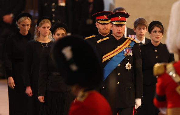 Princ Vilijam i Hari su pokazali znake napetosti i videlo se da su pod stresom dok su stajali oko kovčega kraljice Elizabete na bdenju. Princ od Velsa i vojvoda od Saseksa, obojica obučeni u uniforme, stajali su Vestminster holu oko kovčega kraljice u subotu popodne. Zavladala je tišina dok građani gledali kovčeg, a jedini zvuk bili su koraci njenih unuka koji su se približavali kovčegu. Vilijam je bio kod jednog kraja kovčega i stajao je sklopljenih ruku ispred i pognute glave. Hari je bio pozicioniran na suprotnom kraju, okrenut prema delu hodnika.