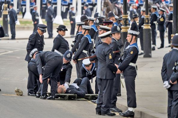 Policajac se onesvestio dok je bio danas na dužnosti u Londonu na sahrani njenog veličanstva kraljice Elizabete DrugePolicajca su na nosilima nosili pripadnici Kraljevske mornarice i neki od njegovih policijskih kolega. Njegovo stanje ostaje nepotvrđeno, ali se ne smatra da je ozbiljno. Slike ispred Vestminster hola gde je kraljičin kovčeg pokazuju da je osoba odnesena u nosilima.