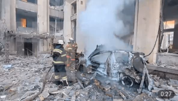 Aleksej Kulemzin, gradonačelnik Donjecka, objavio je snimak na svom Telegram nalogu koji prikazuje gomilu ruševina oko onoga što je izgledalo kao gradska uprava. Drugi snimak koji je postavio Kulemzin pokazuje veliku štetu na zgradi, kao i nekoliko havarijskih i ugljenisanih automobila u blizini. Prema podacima Teritorijalne odbrane Donjecke Narodne Republike (DNR), tokom granatiranja su ranjene četiri osobe.