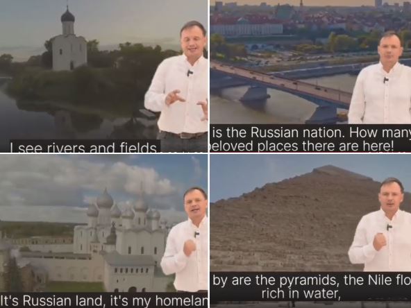 Na snimku se vidi Kiril Stremousov, zvaničnik u hersonskoj oblasti koju je Rusija zauzela tokom svoje "specijalne vojne operacije". On recituje pesmu ispred zelenog ekrana na kojem se vidi niz fotografija iz celog sveta.