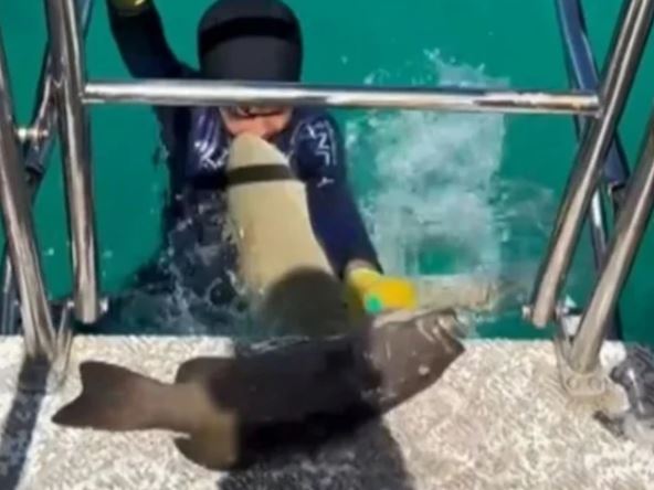 Na snimku objavljenom na društvenim mrežama vidi se kako Mani Alam u ronilačkom odelu visi sa merdevina i rukom ubacuje ribu koju je ulovio na palubu.