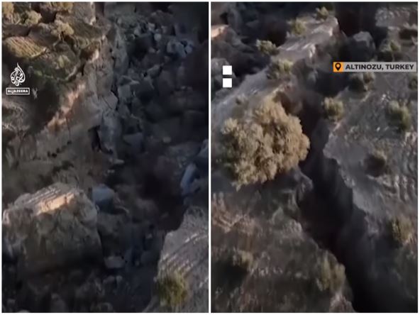 Na ovom snimku dronom se vidi maslinjak u Turskoj uništen potresima. Stena je napukla i nastala je pukotina široka 200 metara. Novostvoreni kanjon dubok je 30 metara i prostire se na površini od 35 hektara, piše Al Džazira, koja je objavila snimak dronom.
