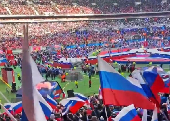 Novinarka Njujork Tajmsa Valeri Hopkins je na stadionu Lužnjiki odakle objavljuje fotografije i snimke. Ona je pokazala i snimke velikog broja autobusa parkiranih kod stadiona. Moskva Tajms izveštava da je jedna vladina institucija primorala 70 odsto svojih radnika da ode na današnji proratni miting, gde su organizatori takođe obećali da će učesnicima podeliti tople obroke i ruske zastave.