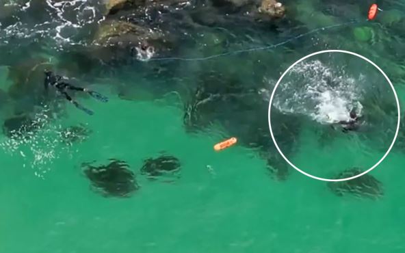 Snimak je nastao uz pomoć drona u vlasništvu Emili Hauman, a na njemu se vide dva plivača kako beže iz mora dok se ajkula kreće ka podvodnim pecarošima.