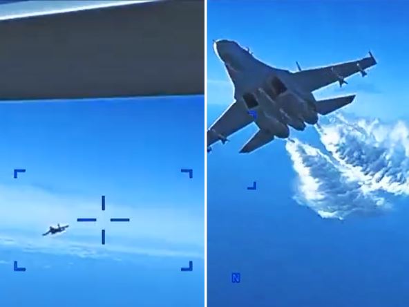 Na snimku koji je objavljen, vidi se ruski avion SU-27 koji leti u pravcu prema američkom dronu MQ-9 i počinje da ispušta gorivo kako se približava, a onda u sledećem trenutku preleće preko drona. Nakon sudara, snimak se prekida i ne vidi se pad aviona u Crno more.