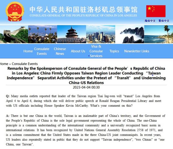 Generalni konzulat je takođe saopštio da se kineska strana odlučno protivi bilo kakvoj poseti lidera tajvanskih vlasti SAD-u pod bilo kojim izgovorom i čvrsto se protivi da SAD imaju bilo kakav oblik kontakata sa tajvanskim vlastima, što krši princip jedne Kine.