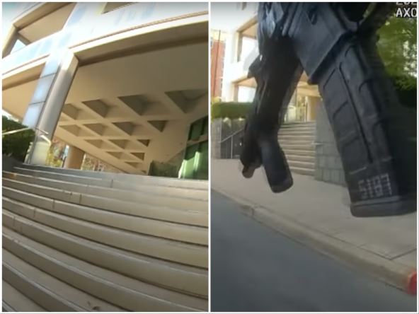 "Mislim da sam ga sredio! Mislim da je pao! Osumnjičenik pao! Dovedite oficira!" čuje se kako kaže na snimku. Potom je ušao u zgradu i prišao osumnjičenom koji je ležao na zemlji pored puške. Policajac Vilt je hitno prebačen u bolnicu i još uvek je u kritičnom stanju.