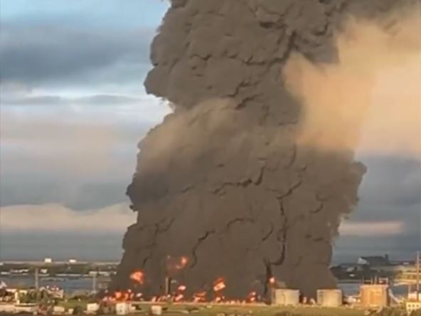 On je rekao da je površina od 1.000 kvadratnih metara zahvaćena plamenom. Na snimcima koji su podeljeni na društvenim mrežama i koji navodno prikazuju požar, vide se plamenovi koji gutaju rezervoare za skladištenje goriva i gust oblak crnog dima koji se diže iznad grada. "Situacija je pod kontrolom naših vatrogasaca i svih operativnih službi", rekao je Razvožajev i dodao da niko nije povređen.