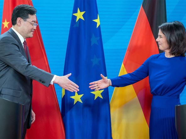 Ćin i Berbok razgovarali su oko 45 minuta u utorak u Berlinu o klimatskoj krizi i naročito o situaciji u Ukrajini. Jedno krupno pitanje o kojem se razgovaralo odnosilo se na osam kineskih kompanija koje bi se mogle suočiti sa sankcijama EU.