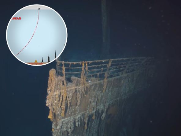 Na slici se nalaze Burdž Kalifa, Ajfelov Toranj, Piramida i Empajer stejt bilding. Levo od njih bi bila olupina Titanika, a ove dve tačke na slici predstavljaju olupinu koja je razdvojena. Leži na dubini od 3.800 metara, a dva dela olupine su udaljena 600 metara. Kada bi ove građevine stajale na dnu gde je i Titanik i to uspravno, do površine vode bi vam trebalo još više od 2 kilometra.