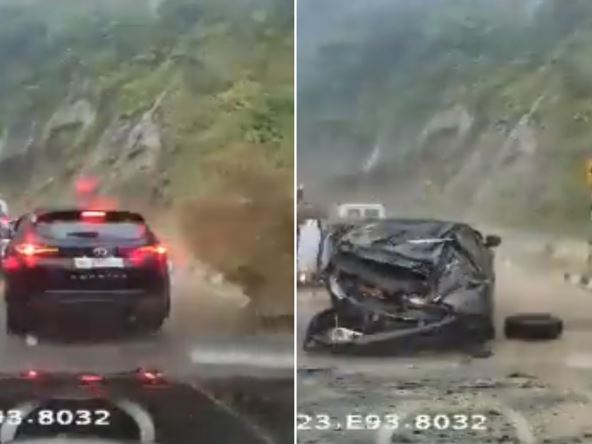 Na snimku koji se vrti po društvenim mrežama, vidi se kolona automobila na putu dok pljušti kiša. Odjednom se pojavljuje velika stena koja se kotrlja i koja prelazi preko dva automobila.
