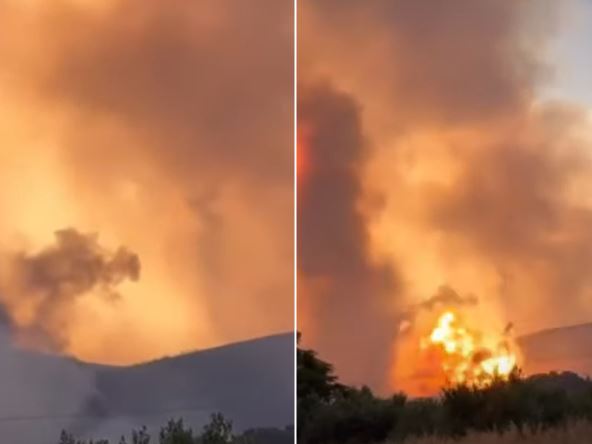 Vojno skladište municije koje se nalazi u oblasti Karamba eksplodiralo je usled požara koji bukte u regionu Volos u Grčkoj. Slučajni prolaznici koji su snimali vatreni stihuju kod Nea Angialosa zabeležili su i trenutak eksplozije.