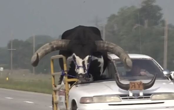 Policiji su drugi vozači prijavili da auto-putem 275 ide čovek u relativno malom automobilu, a da je na suvozačevom mestu ogromni bik. Životinji je virila glava sa ogromnim rogovima, a automobil je bio modifikovan tako da su suvozačeva vrata ojačana rešetkama.