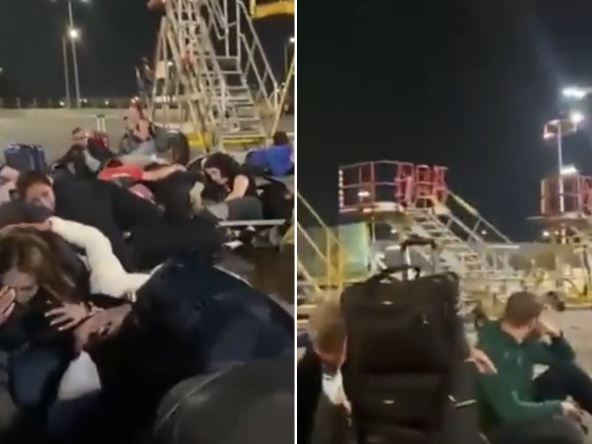 Putnici leže na pisti i pokrivaju svoja tela u strahu i neznanju. Među prisutnima ima i dece, dok se neki putnici telefonom čuju sa najbližima.