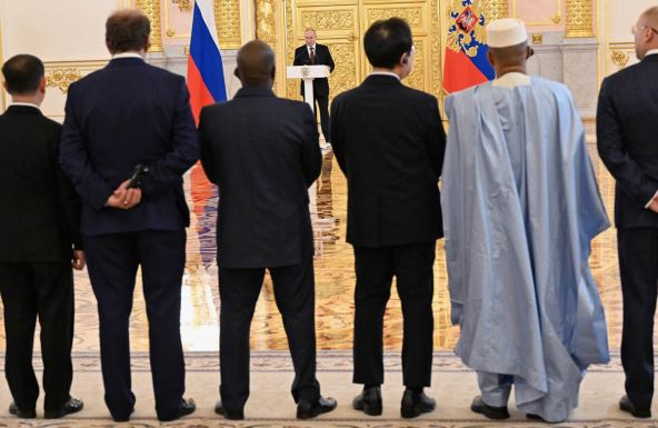Vladimir Putin je juče stajao prilično daleko od novih stranih ambasadora u Rusiji, prizor koji je podsetio na period pandemije korona virusa. Ruski predsednik je na ceremoniji u Kremlju primio akreditive više od 20 stranih ambasadora, među kojima je i najnoviji britanski izaslanik u Rusiji Najdžel Kejsi.
