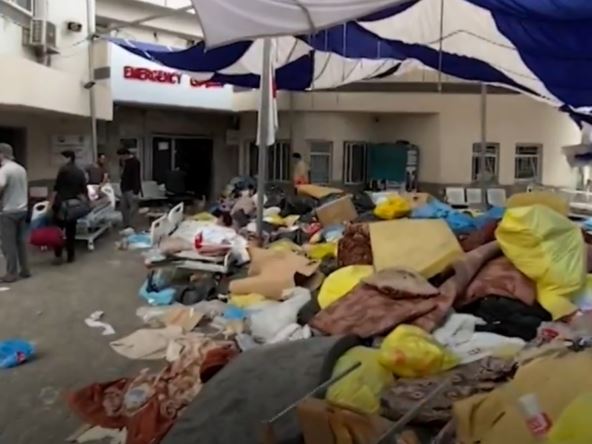 SZO je u saopštenju navela da "desetine hiljada raseljenih ljudi koriste zgradu bolnice kao sklonište" i da postoji "ozbiljna nestašica" vode za piće i hrane. "Tim je za urgentno odeljenje rekao da je 'okupano krvlju', sa stotinama povređenih pacijenata unutra, a novi pacijenti pristižu svakog minuta'", saopštila je organizacija, dodajući da se pacijenti sa traumatskim povredama rane zašivaju na podu, a u bolnici nema lekova protiv bolova, upozorava SZO.