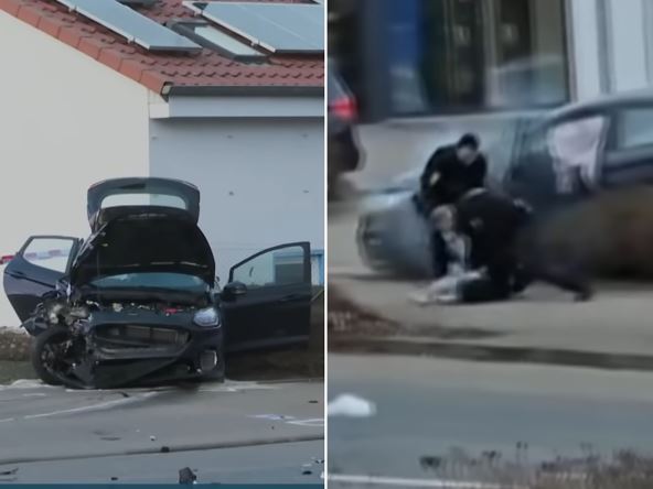 Nakon toga je Adrijan, koji je sin policajca, automobilom pobegao 380 kilometara severno, ali je svojim "fordom" pri brzini od 160 kilometara na sat naleteo na BMV u Zesenu. Čudom, lakše je povređen. Kada ga je policija uhapsila, navodno je vikao na njih. Nemački mediji objavili su snimak na kom se vidi kako ga je policija izvukla iz havarsisanog vozila i privela.