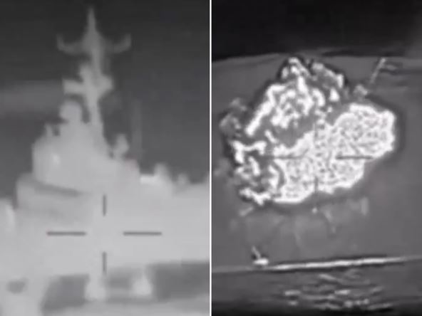 Na snimku koji je objavila ukrajinska vojna obaveštajna služba, vidi se napad morskih dronova na rusku korvetu. Snimak se završava sa slikama eksplozije, a vidi se i kako brod tone.