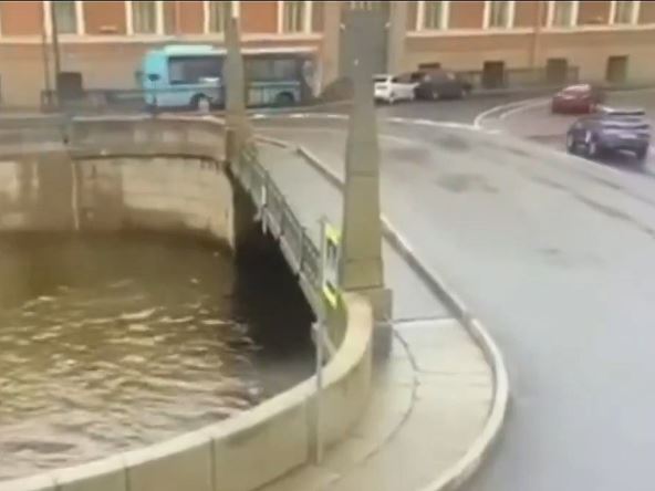 Vozač najpre udara automobil, a potom skreće ka mostu tako probijajući ogradu i na kraju pada u nabujalu reku Nevu.
