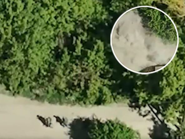 Snimak dronom načinila je pogranična služba. Vidi se ukrajinska jedinica koja je minobacačima granatama pogodila grupu ruskih pešadinaca koji su se probili do ovog grada.