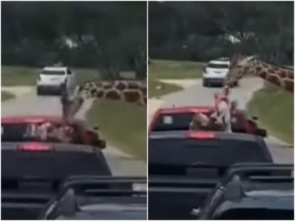 Žirafa je ščepala dvogodišnju devojčicu iz automobila tokom safari vožnje u Teksasu! Džejson Toten (24) i Sijera Robert (23) posetili su sa ćerkicom centar za divlje životinje Fosil Rim u Glen Rouzu jugozapadno od Dalasa. Centar inače omogućava posetiocima da hrane divlje životinje dok se voze kroz park. Sijera i dvogodišnja Pejsli sedele su u otkrivenom delu vozila kad su stigli do žirafa.