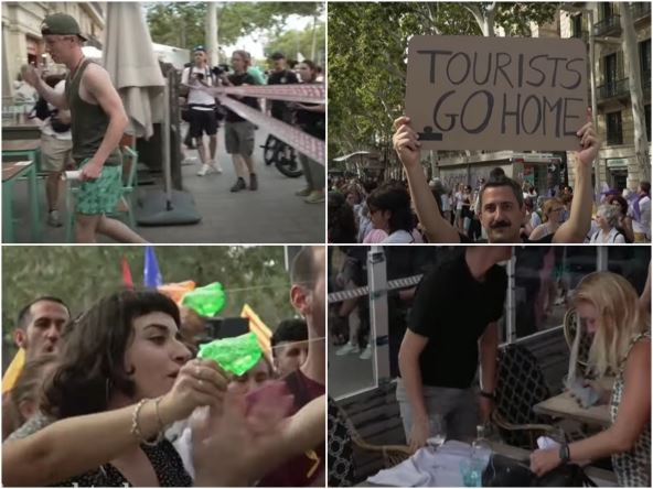 Hiljade demonstranata marširalo je u ponedeljak Barselonom da bi izrazilo ljutnju zbog masovnog turizma i njegovog uticaja na najposećeniji grad u Španiji. Prolaznici koji su večerali u restoranima u popularnoj četvrti La Barseloneta bili su potpuno mokri kada su ih neki demonstranti polivali vodom. Prskali su ih i pištoljima na vodu.