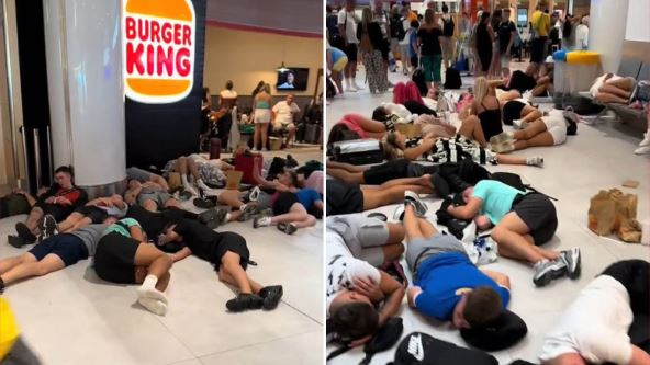 Očigledno iscrpljeni od danonoćnog lumpovanja, mladi nisu birali ni vreme na mesto za spavanje, pa su jednostavno polegali na pod aerodroma, čekajući svoj let.