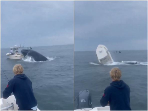 Zastrašujući trenutak kada je grbavi kit prevrnuo mali ribarski čamac u kojem su bila dva preplašena mornara uhvaćen je u utorak kod obale Nju Hempšira. Na neverovatnom snimku se vidi kako životinja glavom gura zadnji deo malog plovila, zbog čega dvoje ljudi pada u more.
